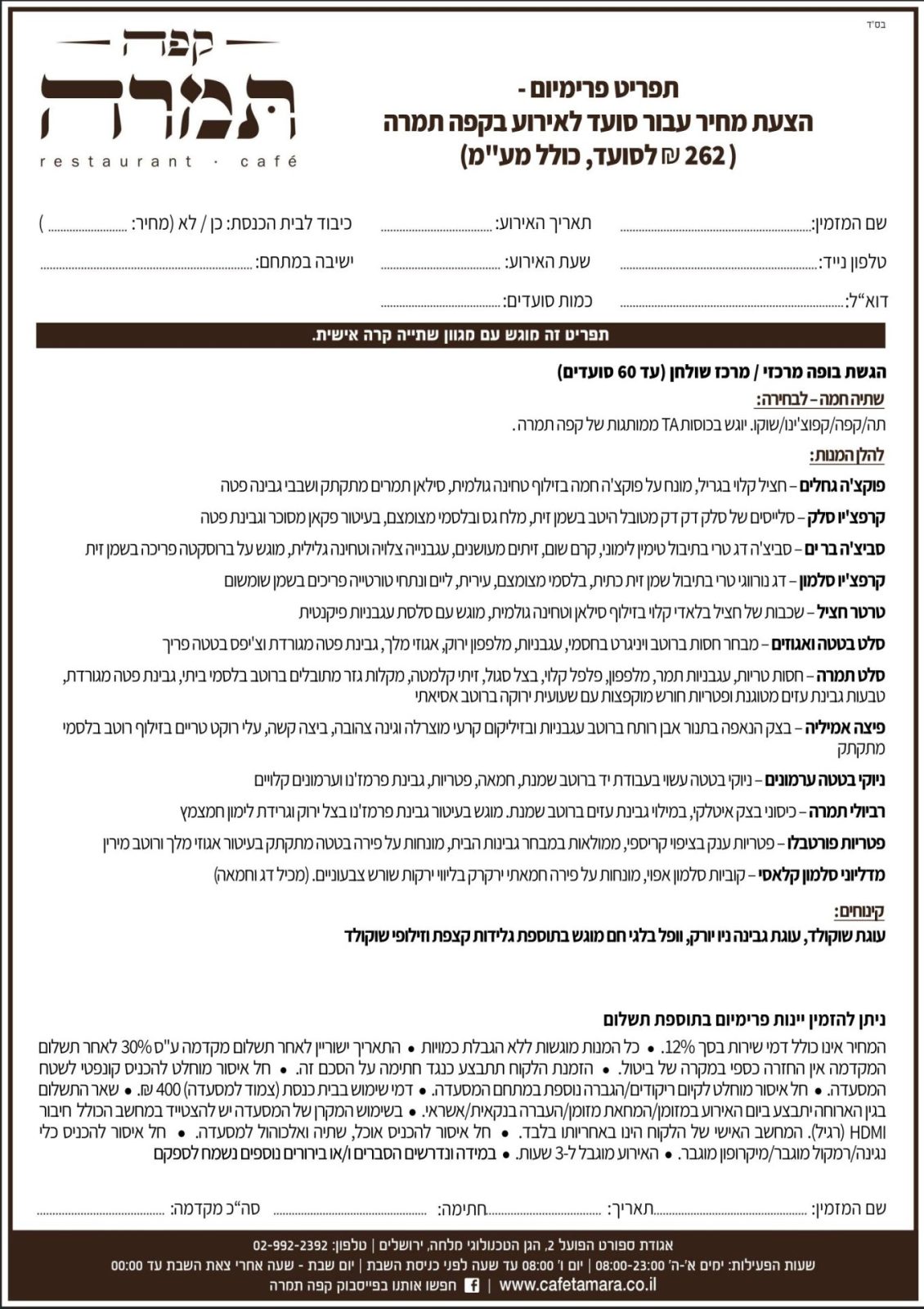 תפריט בייסיק חלבי לאירועים בירושלים – קפה תמרה מסעדה חלבית כשרה למהדריןתפריט סילבר חלבי לאירועים בירושלים – קפה תמרה מסעדה חלבית כשרהתפריט גולד חלבי בירושלים – קפה תמרה מסעדה חלבית לאירועיםתפריט פרימיום חלבי לאירועים בירושלים – קפה תמרה מסעדה חלבית יוקרתית